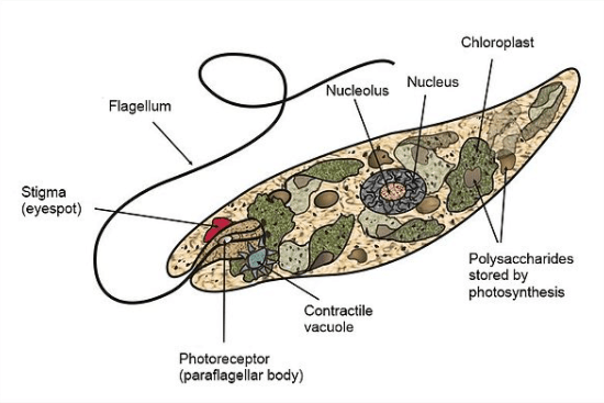 Բջիջները իլիկաձև, ժապավենաձև կամ գլանաձև են՝ 1 կամ 2 մտրակով, ըմպանին հարող ստիգմայով (կարմիր աչք)։ Ակտիվ լողում է ջրում, որոշ տեսակներ կարող են կորցնել մտրակը և անշարժ ապրել ջրի մակերեսին կամ հողում։ Որոշ տեսակներ (օրինակ՝ կանաչ էվգլենա) ջրավազանների աղտոտվածության աստիճանի ցուցիչներ են։