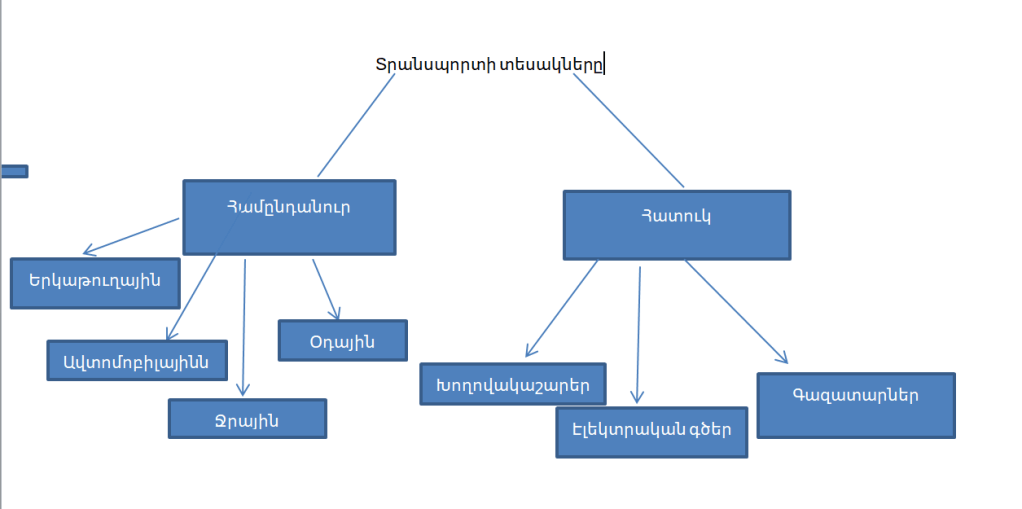 Սխեմայի տեսքով ներկայացնել տրանսպորտի տեսակները։ Նկարագրել դրանցից որևէ մեկը։