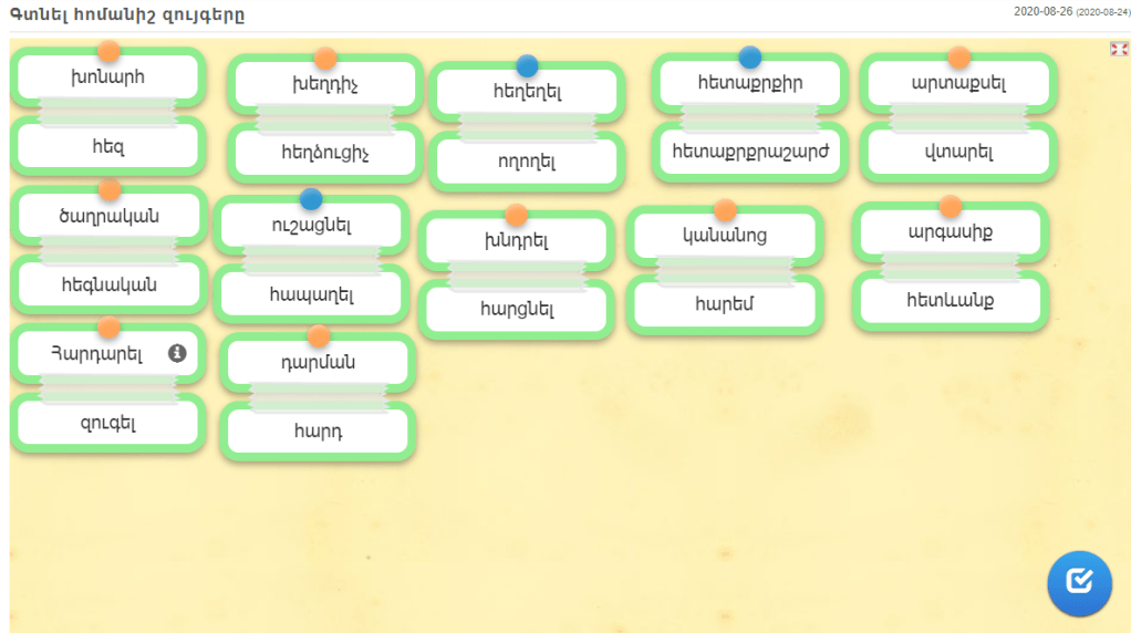 Գտնել հոմանշային բառերը, վիկտորինա։ Արդյունքը screenshot-ի տեսքով տեղադրել բլոգում։