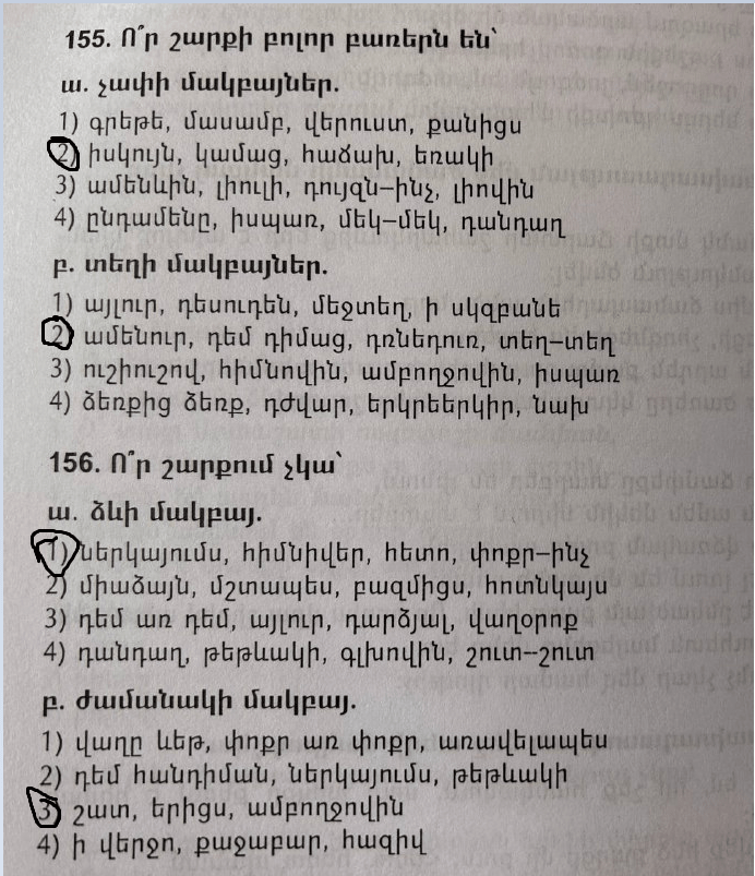 1. Յուրաքանչյուր շարքում գտնե՛լ մակբայը։